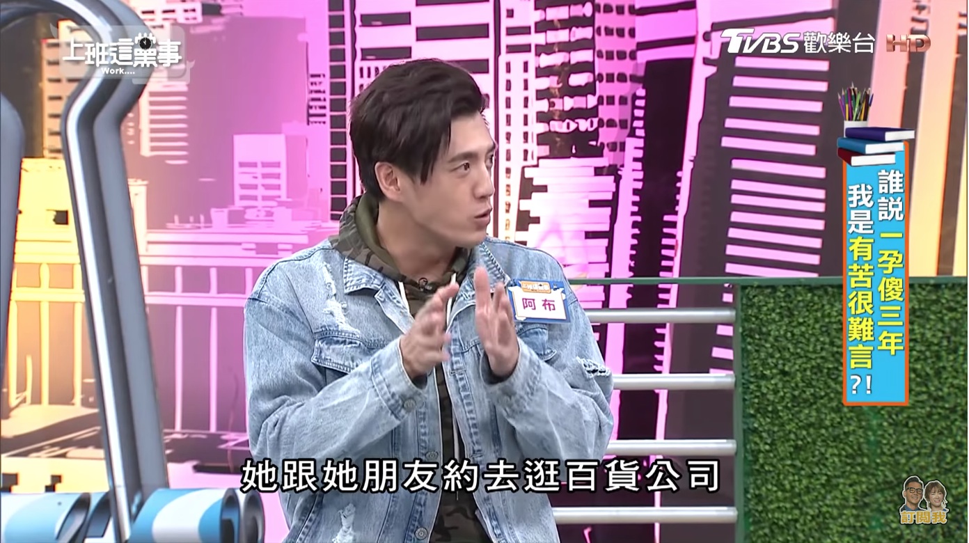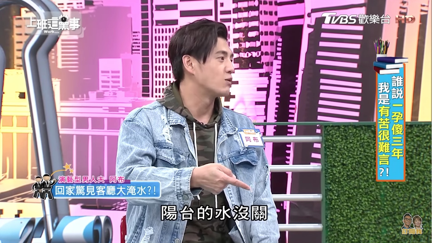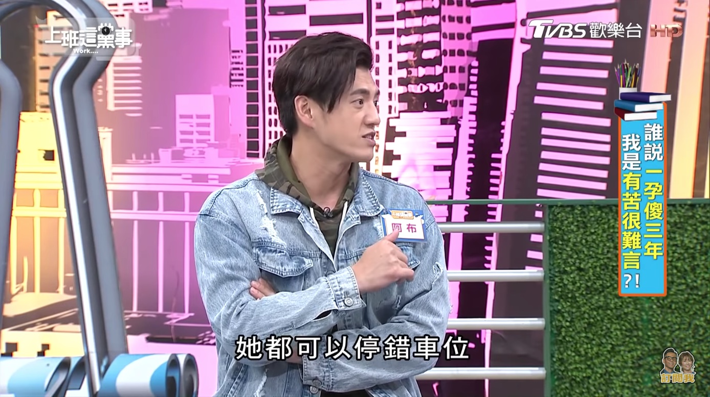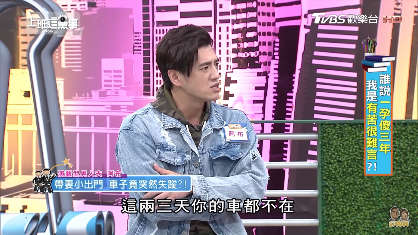 17日播出的《上班這黨事》找來阿布、徐可、何妤玟、甄莉等人,探討女性在生產過後是不是真的思維會變得遲鈍、記憶力出現衰退。其中阿布就透露,老婆生完大女兒後,常常搞錯車位,把車停到別人家去。某次,他因為要用車,下地下室後又發現車不在,以為老婆又停錯位置了,於是找遍整個地下停車場,卻始終找不到愛車。