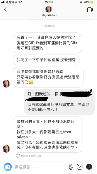 而隔日便有粉絲將此事告知蒨蒨,也得到蒨蒨本人的回應!蒨蒨表示其實自己是無心的:「就是在GIPHY有看到運動比賽的Gifs剛好有對應到的,我找了一下中華民國國旗,沒看到有」,因為在沒看到國旗的情況下,才放了中華台北。