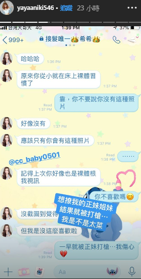 有趣的是亞亞發文不久後,又上傳了好友和自己的對話,原來好友看見她的照片之後便玩笑調侃:「原來你從小就在床上裸體習慣了」,更加碼表示:「記得上次你好像也是裸體跟我視訊」,也讓亞亞笑回:「你不喜歡嗎」,互動相當幽默。