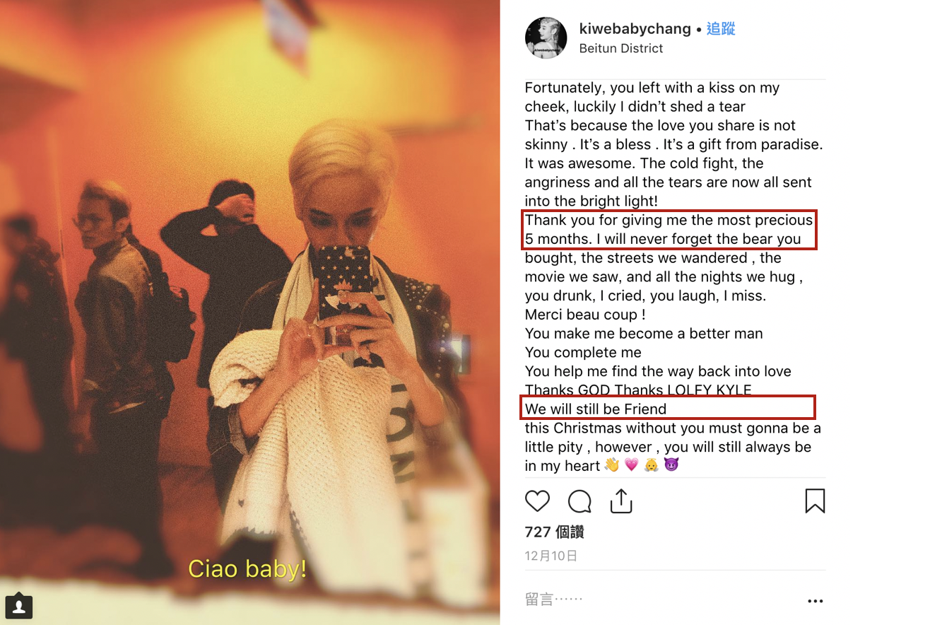 Kiwebaby在今年7月時剛和上一任男友分手,當時分手的原因是男方劈腿,9月時她開始在IG上PO出閃照,並在內文中打上《相愛的33種玩法》,愛得非常高調,閃照也持續到12月初。但是在10號時,Kiwebaby發了一則貼文,內容提到:「Thank you for giving me the most precious 5 months」、「We will still be Friend」,透露出5個月的感情已結束,16號時再度發文吐露分手後的心聲,其中提到:「第一次見到她,其實就大概知道,嗯會是她,她太漂亮了,她渾身散發著小太陽的氣息,她的笑容,灑脫和一點點小迷糊」、「劉若英的成全和林宥嘉的不同,聽得出來那樣的成全,是不後悔的成全,帶了一點私心的嫉妒與懊悔」等等,文句中也出現了「她」,疑似又再度遭到劈腿。
