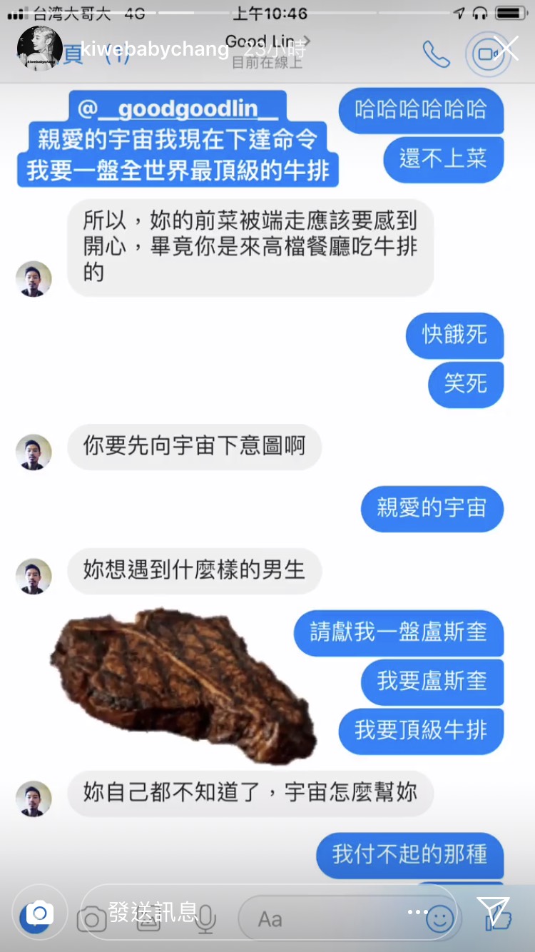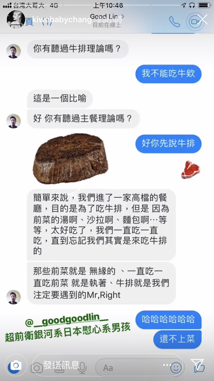 18日時,Kiwebaby在IG的限時動態上發了兩張她和朋友聊天的截圖,圖中她朋友使用「牛排理論」來講述失戀分手,提到:「那些前菜就是無緣的,一直吃一直吃前菜,那就是執著,牛排就是我們注定要遇到的Mr.right」,安慰Kiwebaby「前菜」被端走應該要感到開心,畢竟是來高檔餐廳吃「牛排」的,也讓Kiwebaby搞笑的說道:「親愛的宇宙,請獻我一盤盧斯奎」