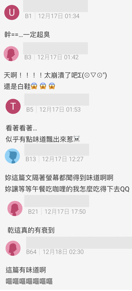 其他網友也紛紛在下方留言:「X…一定超臭」、「天啊!!!!太崩潰了吧Σ(⊙▽⊙") 還是白鞋」、「看著看著…似乎有點味道飄出來惹」、「妳這篇文隔著螢幕都聞得到味道啊啊 妳讓等等午餐吃咖哩的我怎麼吃得下去QQ」、「乾這真的有衰到」、「這篇有味道啊 嘔嘔嘔嘔嘔嘔嘔」
