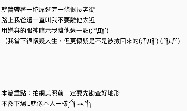女網友更提到:「我爸不是先拿衛生紙給我,而是一直拍我腳上的那坨屎,傳到家群讓大家嘲笑我嗚嗚」,在逛老街的過程女網友的爸爸還一直叫要她他不要太靠近,並露出嫌棄的眼神,讓女網友崩潰表示:「我當下很懷疑人生,但更懷疑是不是被撿回來的」,最後她也提醒大家:「拍網美照前一定要先勘查好地形」,否則就會跟她一樣搞得渾身屎。