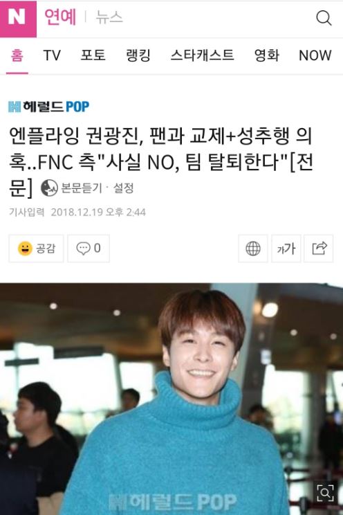 團內貝斯手現年26歲的權光珍,過去曾是CN BLUE出道成員卻因為私人規劃而失去機會,如今跟著團體N.Flying再闖演藝圈,卻爆出和多名粉絲不雅醜聞。一名網友在韓國論壇爆料,指出權光珍曾在簽名會上騷擾女粉,並說到「簽名會時求交往,用大腿夾住我的膝蓋不能動」此外,有粉絲因遭受男友暴力而求助權光珍,他竟落井下石表示「妳要以這個模樣活到什麼時候?再這樣下去,妳就會淪為妓女。」,甚至在私底下議論公司和其他成員的壞話。