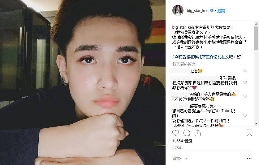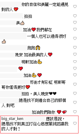 粉絲也紛紛留言幫他加油打氣:「你的自信和美麗一定能遇見對的人」、「拍拍」、「美」、「加油,我們都在」、「一個人也可以過得很好」、「晚安,加油最美的人」、「與後才有彩虹,明軒哥哥你值得更好」、「加油我們陪你」。