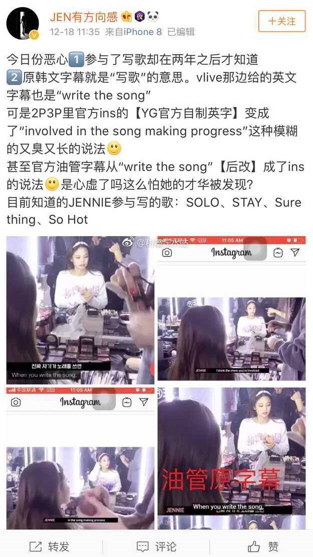 此話一出立刻引起外界熱議,原來歌曲《Stay》Jennie也曾參與製作,不過官方掛名卻只有知名製作人Teddy的名字。對此,微博上就有網友替Jennie平反並說到「參與了寫歌卻在兩年後才知道」,並指出單人出道曲《SOLO》,Jennie也是製作人之一,此外還有多首歌曲包括《Sure Thing》、《So Hot》卻不見Jennie的名字被列在其間。