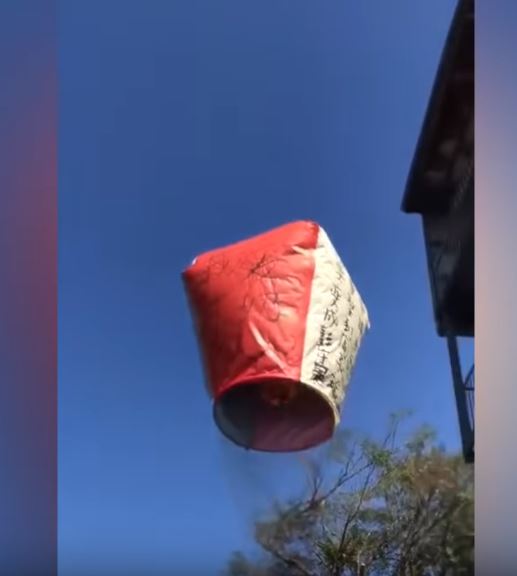 近期,臉書社團「爆廢公社二館」有一支民眾放天燈的影片,起初放天燈儀式看似毫無異狀,一群人將願望寫在紅白相間的紙燈籠上,接著點燃紙張,就抬頭看著天燈緩緩而上。