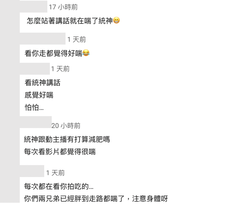 看完影片的網友發現統神一邊走路、一邊講話介紹店家時非常的喘,紛紛留言表示:「怎麼站著講話就在喘了統神」、「統神跟動主播有打算減肥嗎 每次看影片都覺得很喘」、「看統神講話 感覺好喘 怕怕…」、「看你走都覺得好喘」、「每次都在看你拍吃的… 你們兩兄弟已經胖到走路都喘了,注意身體呀」,網友們都非常關心兩兄弟的身體狀況。