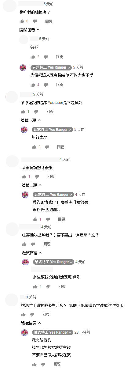 只見許多網友紛紛留言嘲諷:「想吃我的棒棒嗎?」、「做事情請想到後果」、「約炮特工還有臉發影片哦? 怎麼不把頻道名字改成約炮特工」,而葉公則爆氣回嗆:「我爽約就約 這年代男歡女愛還有錯 不要自己沒人約就在哭」、「我的感情 做了什麼事 有什麼後果 跟你們也沒關係」。此外針對網友調侃他的升旗照,他則直白表示:「先傳奶照來就會傳給你 不夠大也不行」、「女生跟我交換的話就可以啊」,毫不避諱。