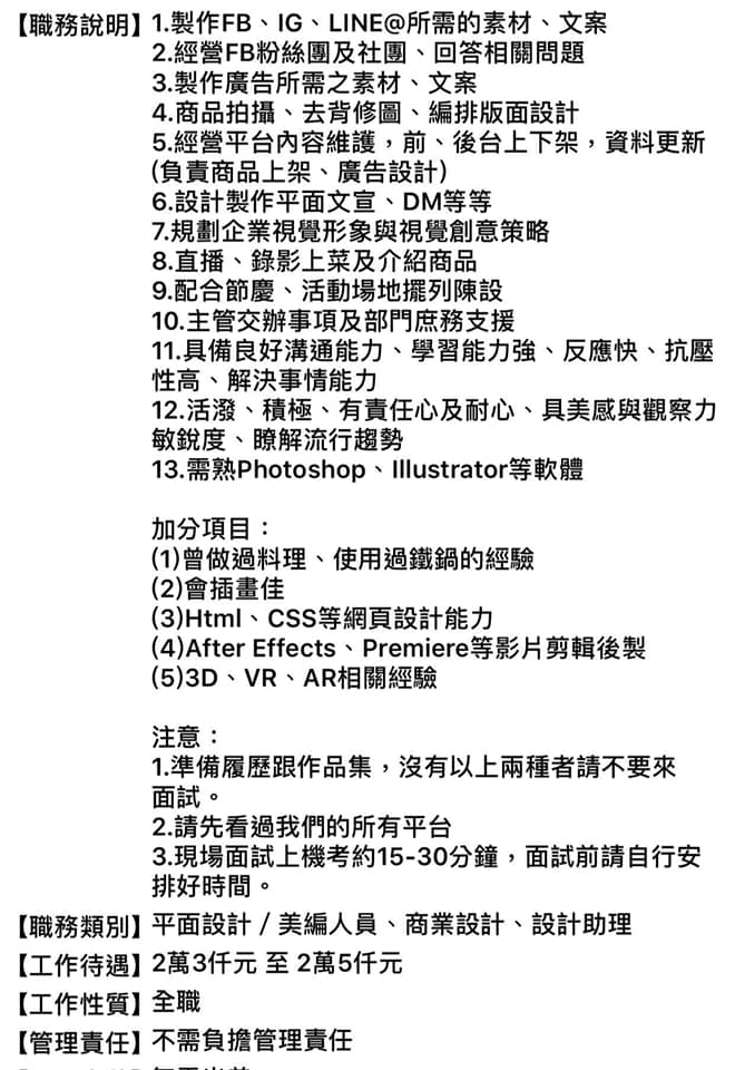 不僅要會社群文案、美術設計、繪圖、網頁設計,甚至在加分項目,還寫著「曾做過料理、使用過鐵鍋的經驗」,連烹飪也要會!除了13巷基本要求,還有5項加分項目和3項注意事項。