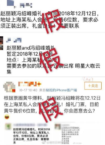 事實上10月16日,趙麗穎和馮少峰對外宣布喜訊後,隔天就有網友出面爆料兩人的婚禮日期定在12月,不過當時馮紹峰工作室的微博就立即出面闢謠。該則貼文中除截圖不實謠言並印上「假」字浮水印,也發文說到「假的,請勿輕信,勿上當受騙!再次感謝大家的關心和祝福」!