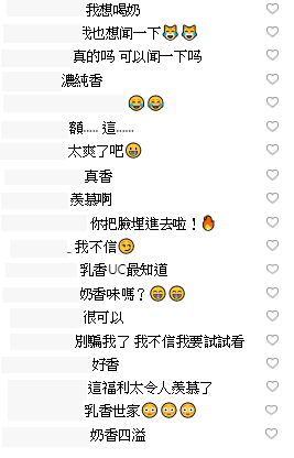 網友見狀紛紛留言打下:「別騙我了 我不信我要試試看」、「這福利太令人羨慕了」、「你把臉埋進去啦!」、「乳香UC最知道」、「濃純香」、「正統奶味」、「乳香世家」、「警察先生 就是他 請把左邊這位小姐帶走」、「奶香四溢」,只能說瑀熙這個福利真的讓粉絲超級羨慕。