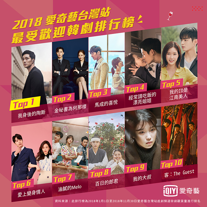 19日,愛奇藝台灣站公布「2018最受歡迎韓劇」前10名榜單,前三名由高到低依序是《我身後的陶斯》、《金秘書為何那樣》和《馬成的喜悅》。其中9月推出的韓劇《陶斯》,是資深男星蘇志燮睽違三年再度推出的新作品,播映短短兩個月時間在愛奇藝的瀏覽人次已經突破千萬,劇中飾演「反差萌特務」的蘇志燮,一改過去帥氣沉穩的形象,透過喜劇手法包裝特務片也讓觀眾耳目一新。