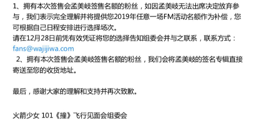 對此,火箭少女官博也緊急轉貼孟美岐的文章,並且提出替代方案彌補粉絲。針對已經搶到孟美岐簽售名額的粉絲,公司提出補償方案包括「2019年任意一場FM活動會名額」,以及將孟美岐的簽名專輯寄到粉絲手上,不過粉絲因擔心孟美岐身體而不滿表示「藝人有病自己發聲明也真是醉了」,甚至想起孟美岐回歸後C位變動抱怨「C位被換的的連個正經聲明也沒有,瞎拉了個假C強取盜走C位」。