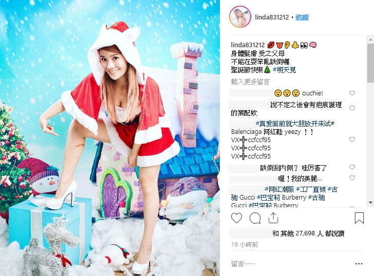 雖然琳妲的傷勢看起來十分嚴重,不過她仍露出笑容拍攝聖誕應景照片,非常堅強。而這次招牌美腿掛彩,也讓粉絲十分擔心會不會留疤,叮嚀琳妲一定要好好照料傷口。