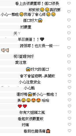 粉絲見狀後一一留言打上:「看起來很嚴重欸」、「看到也覺得痛」、「看上去很嚴重耶!傷口很長」、「真的要小心一點啦,我看了會心疼」、「好嚴重」、「早日康復!」、「誇張耶!也太長一條⋯⋯」、「看起來好深」、「好大的傷口」、「小心一點啦!」。