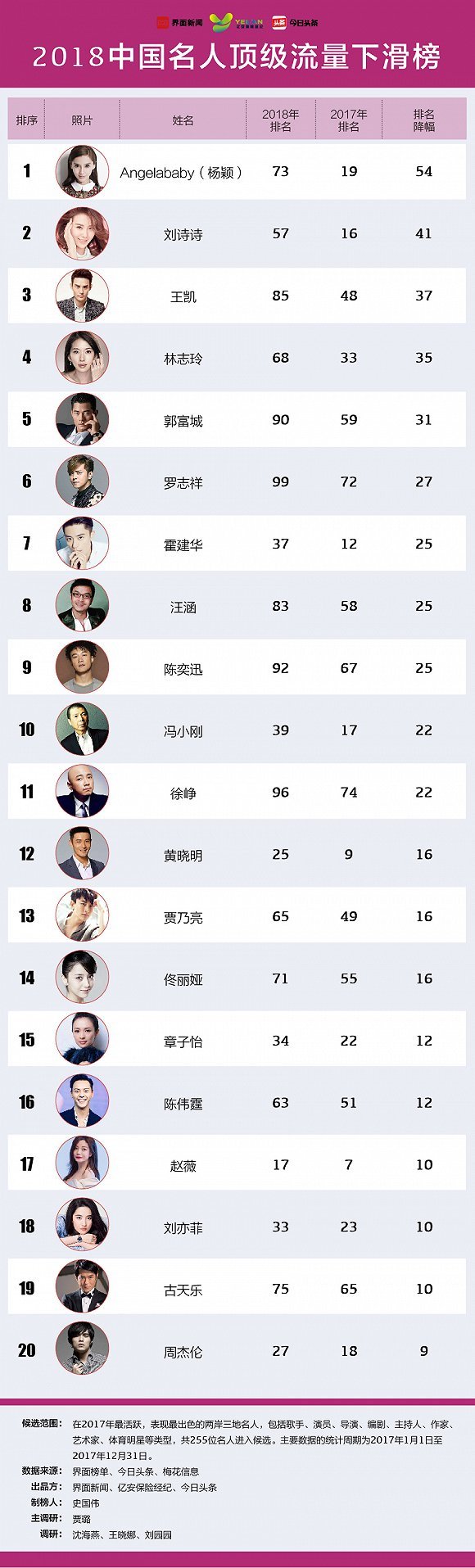近年來網路上的社群發達,有許多人會統計整年中藝人及網紅的火熱度,做成年度發燒排行榜,但近日就有大陸媒體做了一份相反的調查,要調查在2018年於網路「流量下滑」的藝人排行,媒體統計了過去兩年時間內,娛樂圈名人流量的變化程度,隨後發佈了2018名人頂級流量下滑榜,而看到榜單後也讓網友相當吃驚,讓我們趕緊來一瞧這次入榜的藝人。