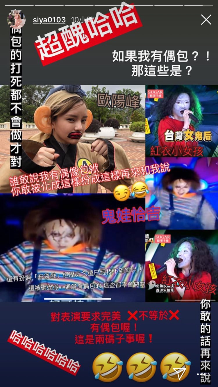 斯亞也在限時動態中寫著。自己對表演的要求很高,但要求完美並不等於有偶像包袱,「這是兩碼子事喔!」強調如果真的有偶包,這些裝扮她怎麼可能同意,更霸氣放話:「你敢的話再來說!」