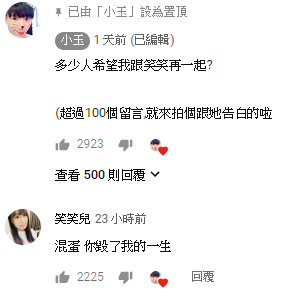 而影片上傳之後,小玉也留言:「多少人希望我跟笑笑在一起?超過100個留言,就來拍個跟她告白的啦」,眼下留言已經高達500則,讓人十分期待小玉是否會真的拍攝跟笑笑的告白影片!而笑笑也留言寫下:「混蛋 你毀了我的一生」,笑翻網友。