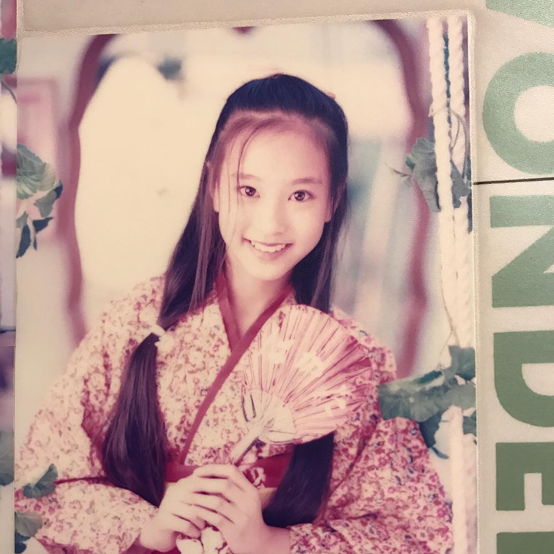 照片中看到,容嘉小時候就長得十分別緻,水汪汪的大眼睛再加上甜美的笑容,披著一頭飄逸的及腰長髮,穿著一身紅色意花和服,手裡還拿著小扇子,整個人散發濃濃的古典味。
