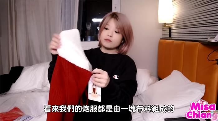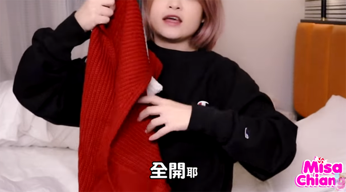 過去米砂便已經兩度開箱過處男殺旗袍,近日聖誕節將至,21日她上傳新影片開箱聖誕節專屬的童貞殺(處男殺)毛衣。米砂透露自己拍片時人正在日本的飯店,衣服也是剛剛從日本商店購來的,連標籤都來不及剪。打開之後可以看到這次的聖誕戰鬥服又是只有一快布料,並且後面大範圍全開,讓米砂驚呼:「側乳又會一個完美露出」,她也將衣服放在自己身上比一比,發現背後的開洞將會直接露出股溝:「那我的屁股這邊大概就是.....會直接露出股溝了」。