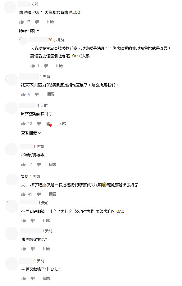 影片播出之後,許多網友紛紛留言:「不要打馬賽克」、「處男錯了嗎? 大家都欺負處男」、「像我這樣的非現充魯蛇就是原罪!」、「我真不知道我們處男到底是招誰惹誰了」、「最近怎麼越來越大膽了」、「處男跟你有仇?」。