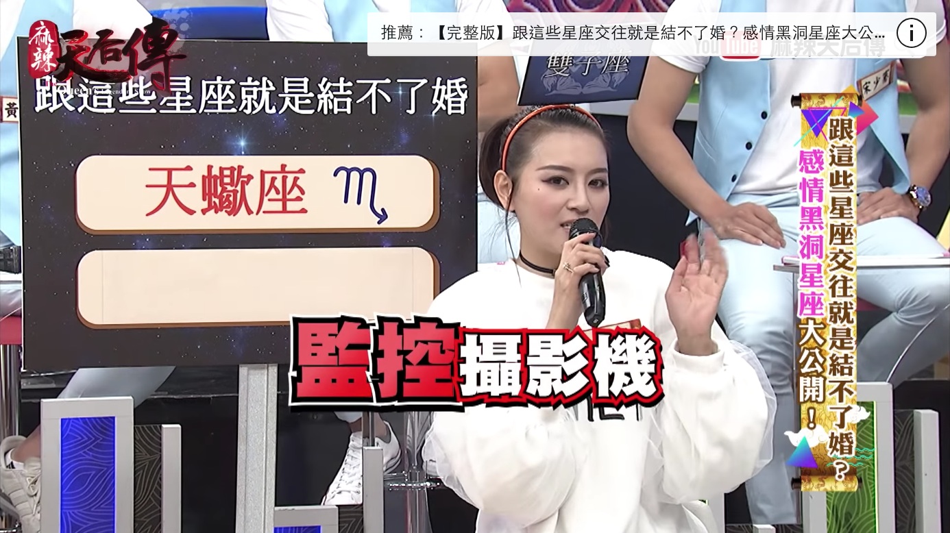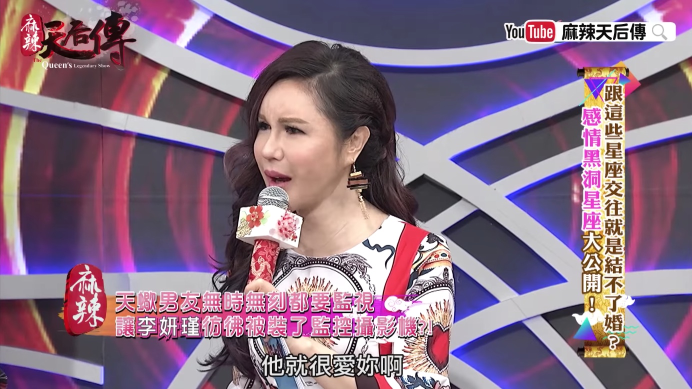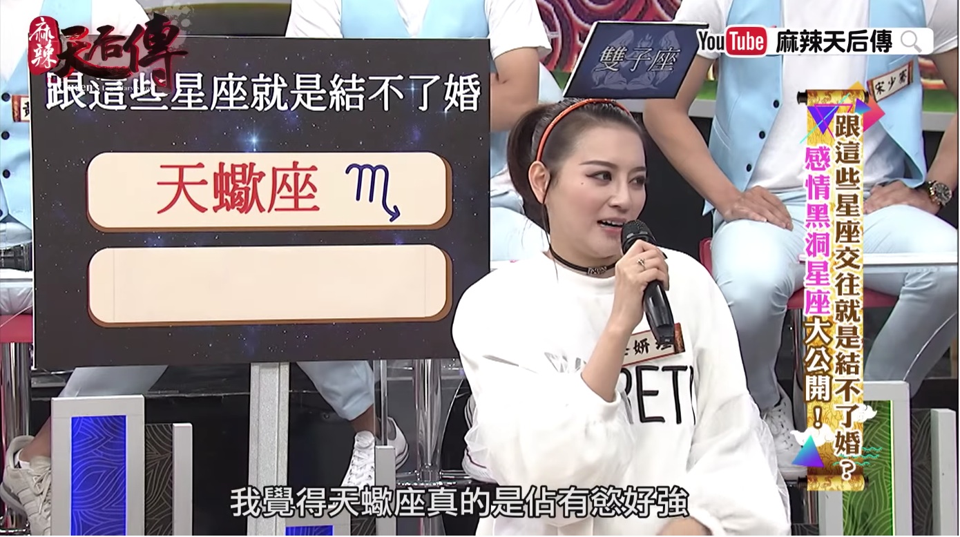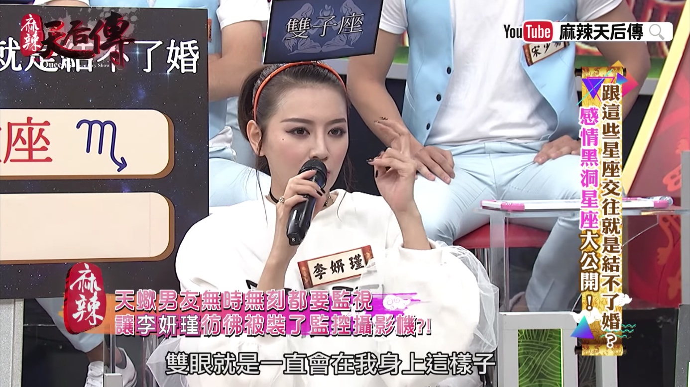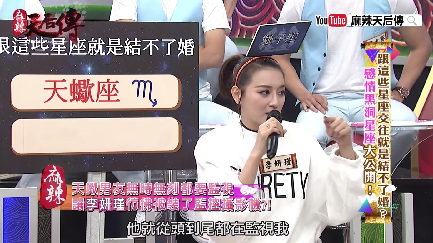 《麻辣天后傳》日前播出「跟這些星座交往就是結不了婚-感情黑洞星座大公開」單元,找來多位藝人分享自己交往過的對象星座,其中李妍瑾就表示,過去跟天蠍男交往時,終於體會到人家說的那種「天蠍座的佔有慾」。她舉例,某次跟朋友一起出去玩,想說男友也認識,就帶著他一起出席,沒想到男友竟突然生氣,認為她都沒顧到他的感受,還不斷mur mur「為什麼都要跟妳的朋友出去」,表示自己希望能夠有「兩個人的時間」。