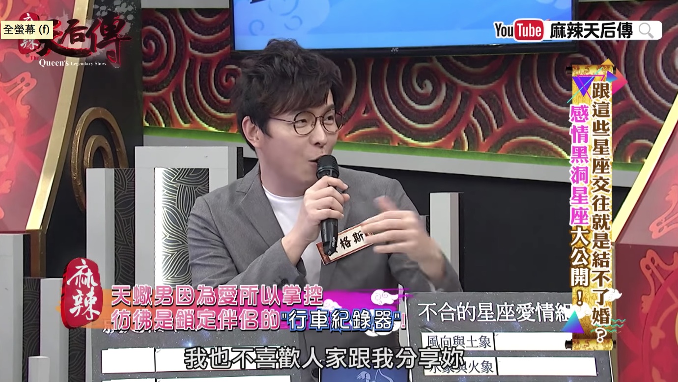 對此,主持人利菁認為那是對方愛的表現,但李妍瑾卻說「那已經愛到有點負擔了」。而安格斯老師則說,天蠍座確實在感情裡容易變得緊迫盯人,但這只是出自於「他愛你」,「如果他不愛妳,他鎖定的是所有人;如果他只針對妳,當別人的目光到妳身上的時候,天蠍就會干擾,因為我喜歡妳,所以我不喜歡人家跟我分享妳。」