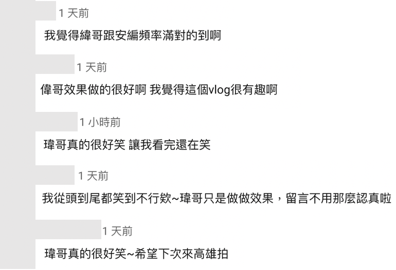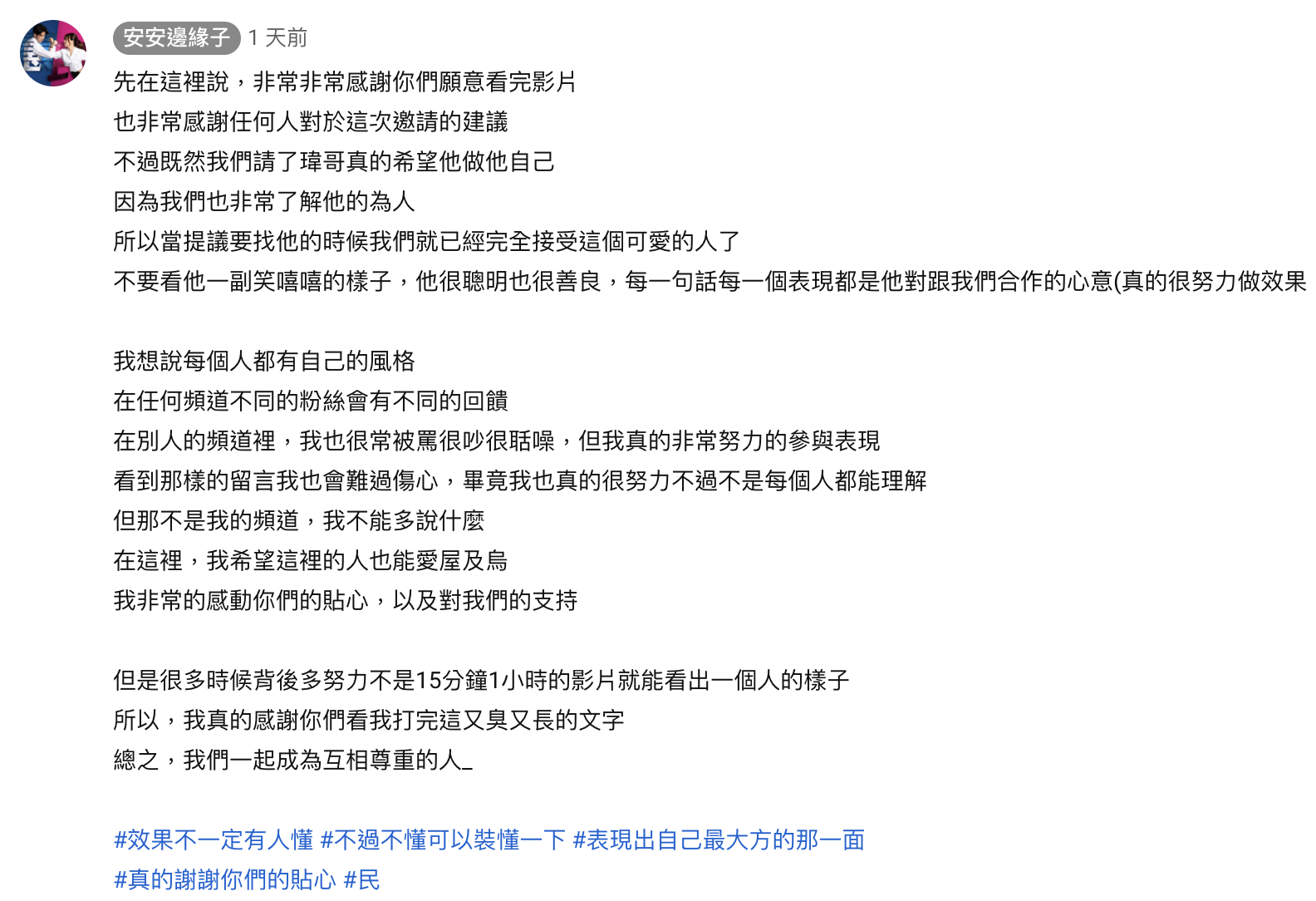 但是許多網友也留言力挺瑋哥:「我覺得瑋哥跟安編頻率滿對的到啊」、「瑋哥真的很好笑~希望下次來高雄拍」、「我從頭到尾都笑到不行欸~瑋哥只是做做效果,留言不用那麼認真啦」、「瑋哥效果做的很好啊 我覺得這個vlog很有趣啊」、「瑋哥真的很好笑 讓我看完還在笑」,阿民也親自留言說道:「先在這裡說,非常非常感謝你們願意看完影片,也非常感謝任何人對於這次邀請的建議,不過既然我們請了瑋哥真的希望他做他自己,因為我們也非常了解他的為人,所以當提議要找他的時候我們就已經完全接受這個可愛的人了,不要看他一副笑嘻嘻的樣子,他很聰明也很善良,每一句話每一個表現都是他對跟我們合作的心意(真的很努力做效果」,也希望粉絲們能夠互相尊重。
