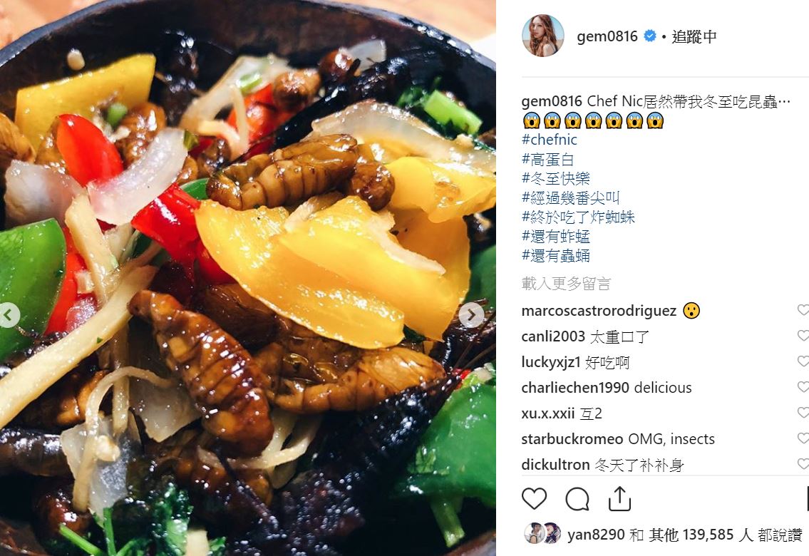 23日,鄧紫棋又在社群平台中分享「昆蟲大餐」照,眼看照片中一整盤的蟲子,畫面十分驚悚。照片中,鄧紫棋拿著一個「昆蟲串燒」表情似乎相當淡定帶著一抹微笑,而另一盤昆蟲雜燴裡,除了有甜椒、洋蔥等蔬菜點綴,褐色的蟲蛹一把把散落其間,讓網友看了直呼「對於昆蟲恐懼症很不友好」、「好噁」、「你吃得下去嗎」。