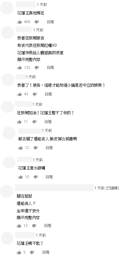 網友看到之後,則紛紛留言:「花蓮王真他媽狂」、「笑死,趕緊看一下129集壓壓驚」、「恭喜了!被告,這樣才能知道小編是否中立的娛樂!」、「小編好有才喔(被吉辛苦了」、「狂新聞加油!花蓮王整不了你的!」、「花蓮王查水錶囉」、「都去關了還能吉人.臉皮厚比城牆啊」。