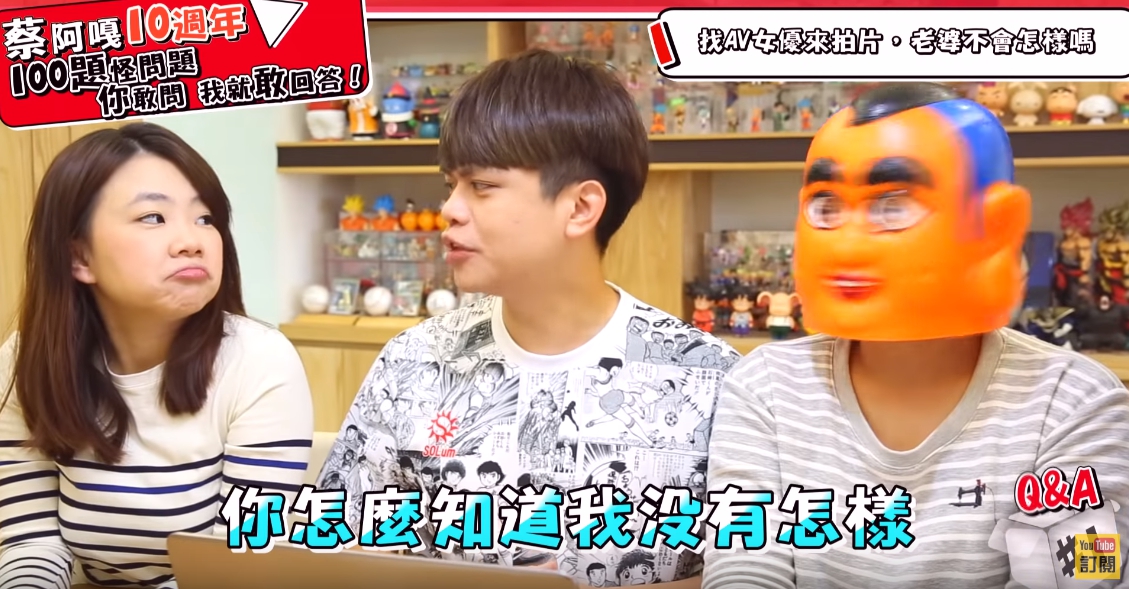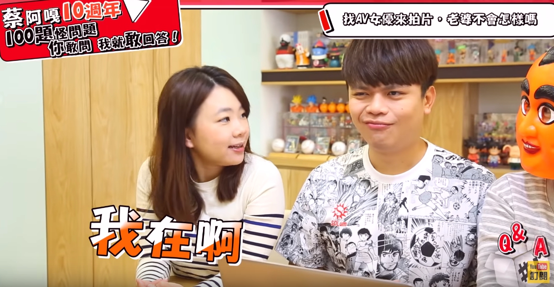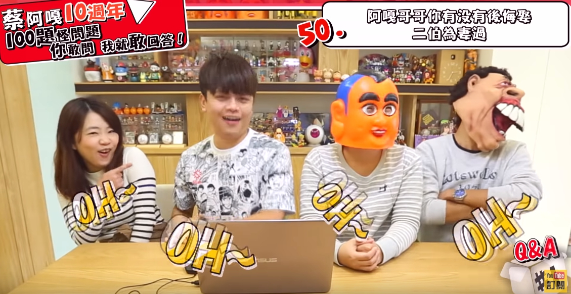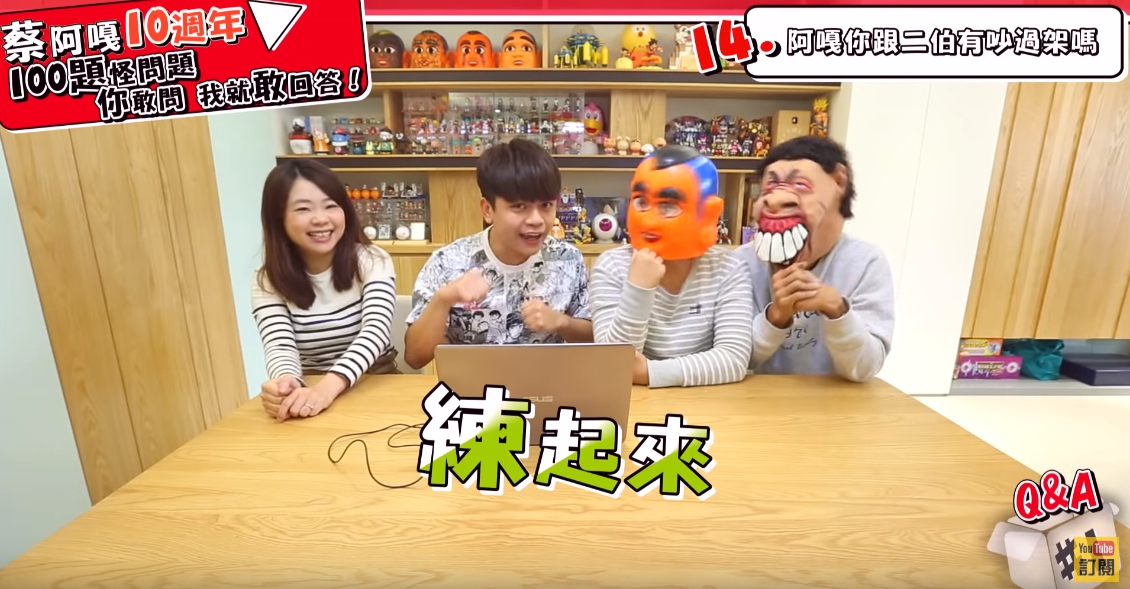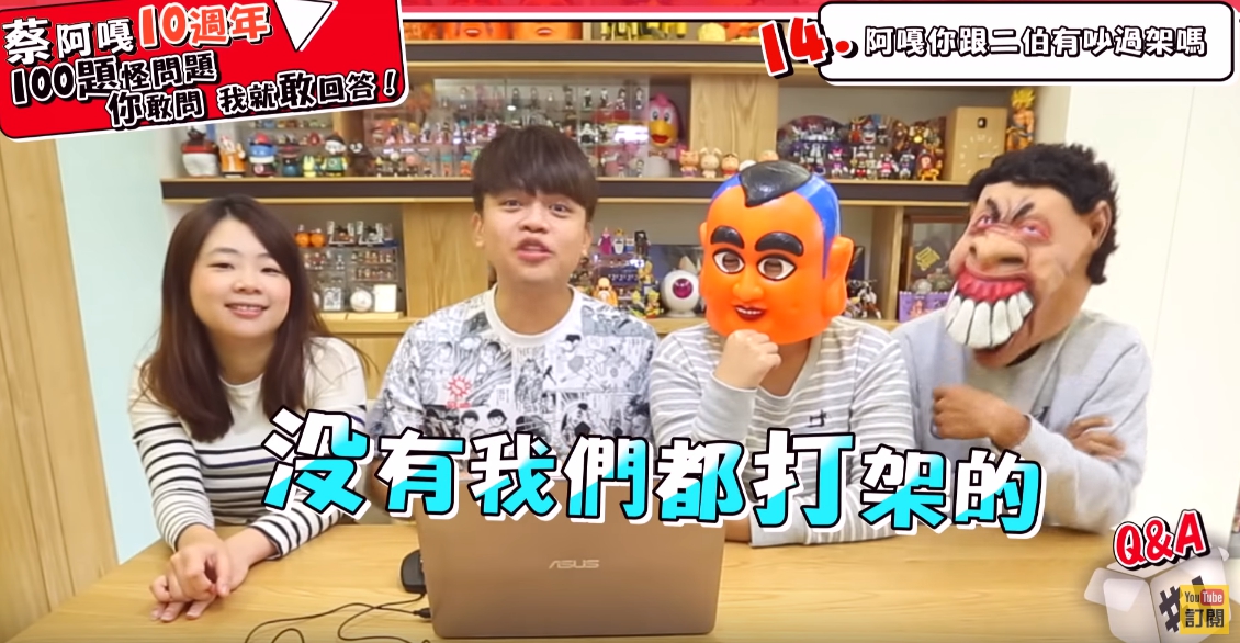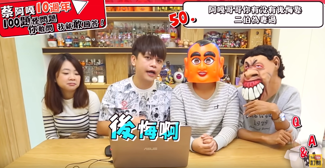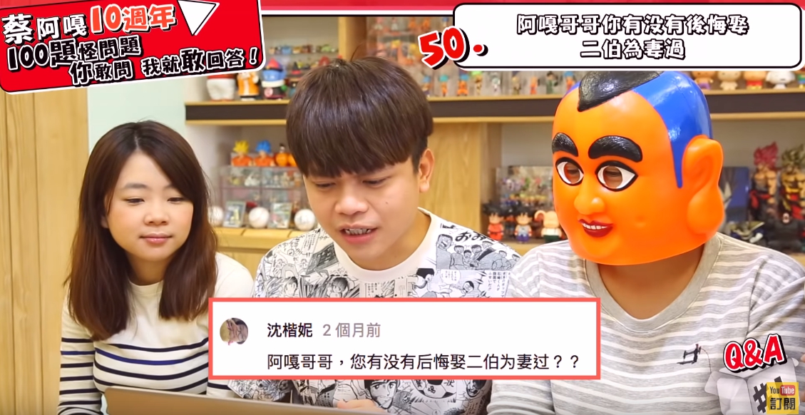 這次推出的慶祝十週年,蔡阿嘎打算拍十集,每集都回答100個問題,整個團隊還笑稱大概要過五年才會完整拍完,其中阿嘎在問答中,遇到一位網友相當犀利地問:「阿嘎哥哥你有沒有後悔娶二伯為妻過?」,蔡阿嘎隨即表示:「後悔啊」,只見二伯表情癟嘴,不過蔡阿嘎立馬補答:「後悔沒有早點娶啊!」,當下閃爆全場,二伯也露出甜笑,果然是愛妻的阿嘎!