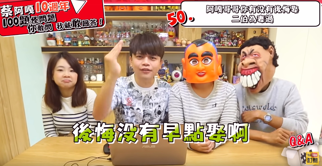 在台灣Youtuber界上,有著長青樹之稱的蔡阿嘎,自2008年以來創作出不少逗趣、好笑的影片,今年滿十週年時更是風光舉辦十周年紀念展,回饋給所有觀眾粉絲及好友,更在今年與老婆「二伯」育有一子「蔡桃貴」,可以說是愛情家庭事業通通都得意,平時也時常在粉絲團分享日常生活,看似非常幸福的生活,怎麼會讓阿嘎在這次十週年Q&A上回答後悔娶二伯呢?讓我們繼續看下去!