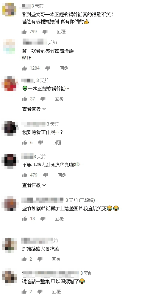 影片結束後,許多網友們看到盛大哥後,紛紛留言:「看到盛大哥一本正經的講幹話 真的很難不笑!居然有這種嫖妓倆 真有你們的」、「第一次看到盛竹如講幹話WTF」、「一本正經地講幹話」、「我到底看了什麼...?」、「不要叫盛大哥念這些鬼啦XD」、「盛竹如講幹話再加上這些圖片我直接笑死」、「是誰給盛大哥吃藥」、「講幹話一整集 可以開頻道了嗎?」