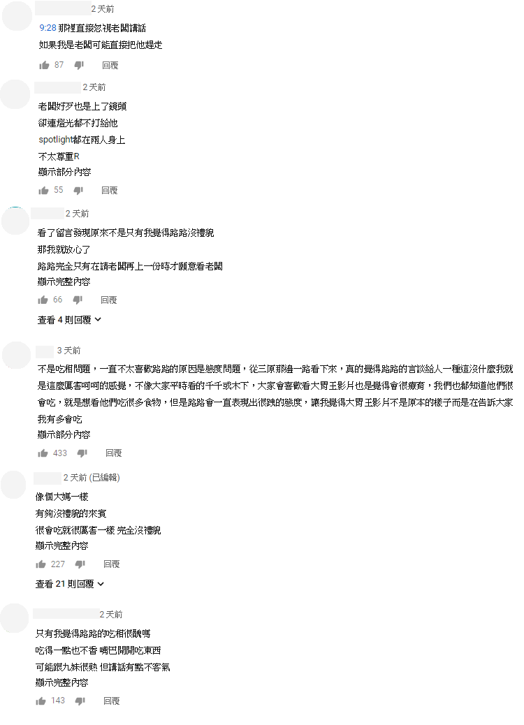 影片播出之後,許多網友紛紛留言:「那裡直接忽視老闆講話 如果我是老闆可能直接把他趕走」、「老闆好歹也是上了鏡頭 卻連燈光都不打給他 spotlight都在兩人身上 不太尊重R」、「真的很討厭路路 也沒比其他大胃王強 可是態度囂張又沒禮貌」、「這很明顯是態度差、無視老闆」、「看了留言發現原來不是只有我覺得路路沒禮貌 那我就放心了」。