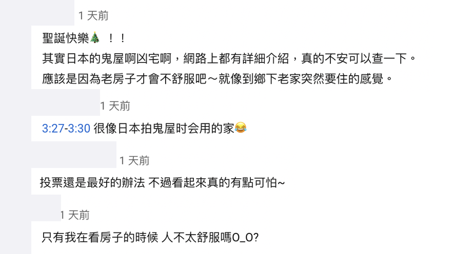 最終投票決定是留在目前的民宿,劉沛也投下留下的票,開票完畢後菜喳也提到:「現在決定要住這了,就不要再講這些有的沒的,會讓人不舒服」,看完影片後網友也紛紛留言:「其實日本的鬼屋啊凶宅啊,網路上都有詳細介紹,真的不安可以查一下。應該是因為老房子才會不舒服吧~就像到鄉下老家突然要住的感覺。」、「投票還是最好的辦法 不過看起來真的有點可怕~」、「很像日本拍鬼屋時會用的家」、「只有我在看房子的時候 人不太舒服嗎O_O?」,魚乾也在下方回應:「睡第一天發現床超好睡,後來就不想走了XDD」