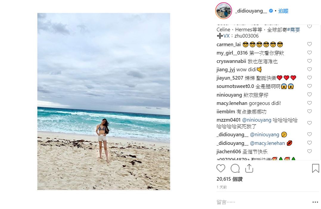 24日,歐陽娣娣在個人Instagram中分享自己前往海邊度假的照片,貼文中,她也心情愉悅表示「在海邊的平安夜」。照片中的歐陽娣娣罕見穿著比基尼入鏡,遠看過去,她下身的短褲露出白皙大長腿,讓網友直呼「性感娣娣在線撩人」、「全是腿啊」、「性感辣妹」,不過也有粉絲擔心說到「衣服穿好」,歐陽娣娣罕見曬出好身材意外引起網友熱議。