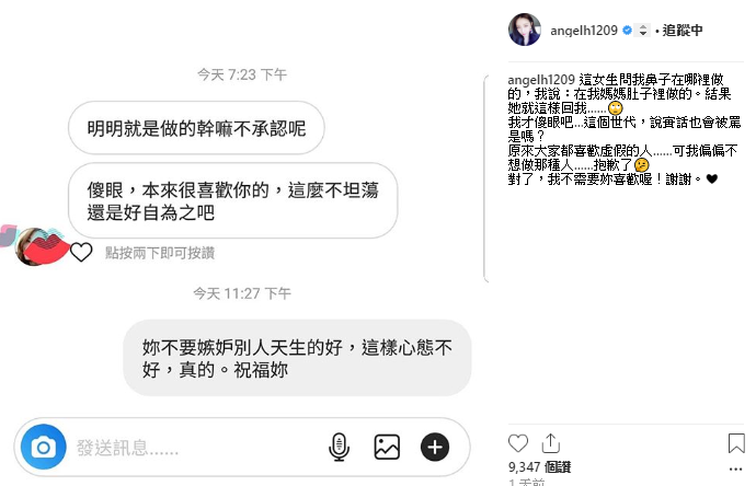 看到自己莫名被嗆,韓瑜忍無可忍直說:「我才傻眼吧!」,無奈感嘆「這個世代說實話也會被罵是嗎?」她忍不住回了女網友:「你不要忌妒別人天生的好,這樣心態不好,真的。祝福妳」