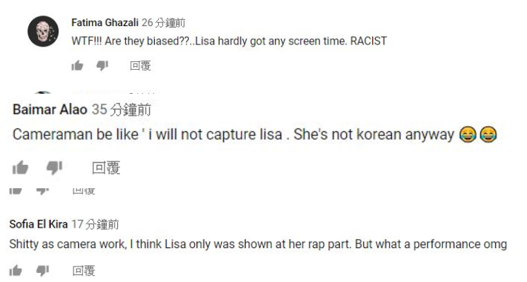 此外,更多網友評論此次演出中Lisa的鏡頭相比3位成員少的可憐,甚至懷疑是因為Lisa不是韓國人的關係,根據網友指出,Lisa除了開頭和饒舌部分幾乎找不到鏡頭,因此憤而說到「看不到Lisa跳舞片段」、「攝影大哥不拍Lisa,是因為反正她不是韓國人?」,然而此次BLACPINK的賣力演出仍然大獲好評。