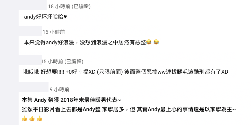 看見Andy如此有心的準備聖誕驚喜,網友也紛紛留言:「本來覺得Andy好浪漫,沒想到浪漫之中居然有惡整」、「Andy好壞壞哈哈」、「哦哦哦 好想要!!!!! +0好幸福XD (只限前面) 後面整個惡搞ww連拔腿毛這酷刑都有了XD」、「本集 Andy 榮獲 2018年末最佳暖男代表~雖然平日影片看上去都是Andy整 家寧居多,但 其實Andy最上心的事情還是以家寧為主~」