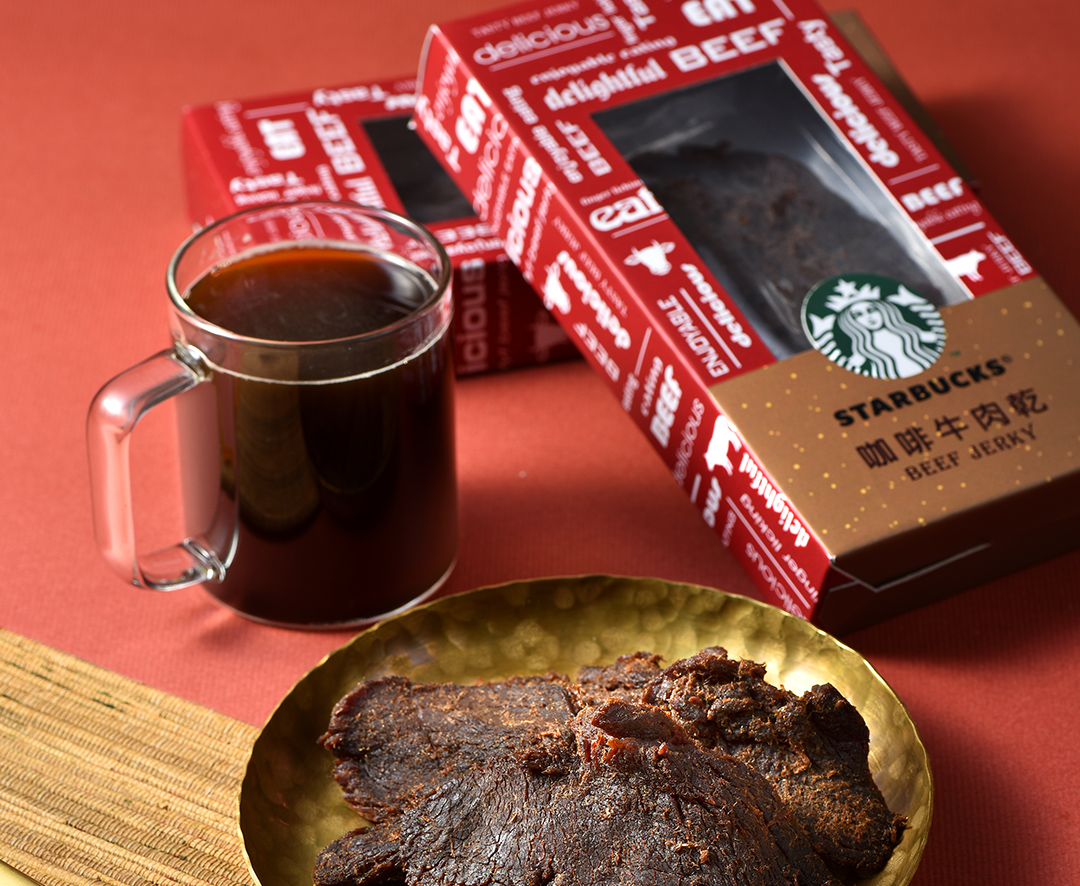 除此之外,星巴克居然還推出了「牛肉乾」!?台式的經典牛肉乾和星巴克義式咖啡搭配,研發出了微苦的咖啡口味「咖啡牛肉乾」,及正統台灣味的「辣味牛肉乾」,以經典滷汁與紅辣椒慢火焙炒。兩款牛肉乾都特別用紅色包裝,送禮自用兩相宜。