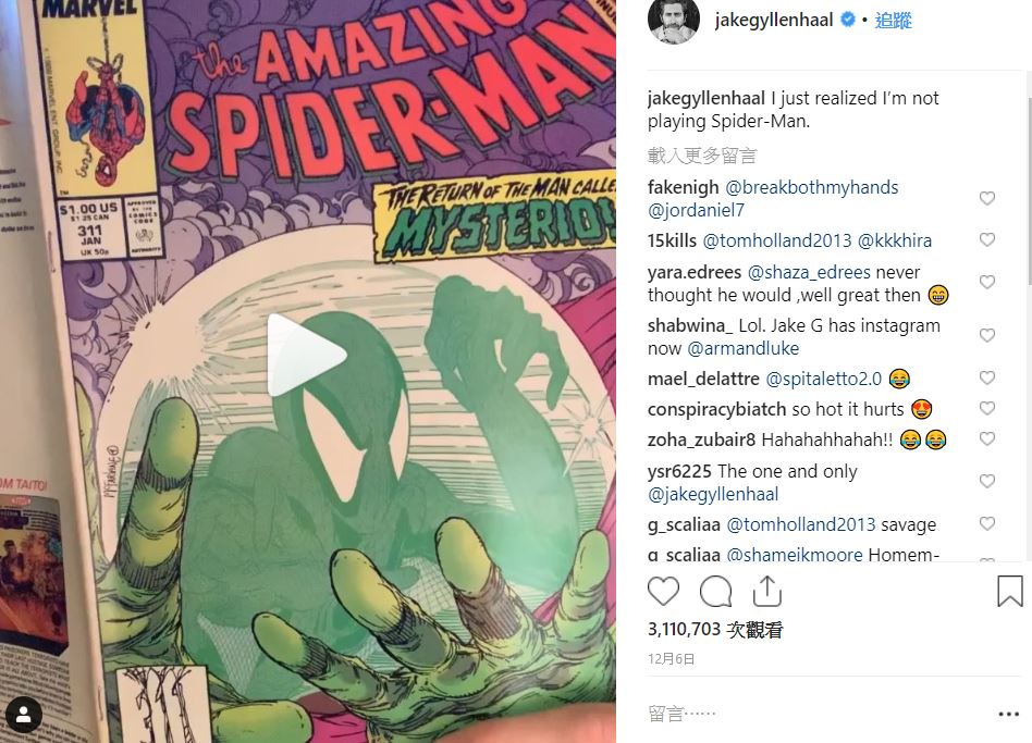 ▼傑克葛倫霍首度開設 Instagram 帳號,就搞笑拍攝短片:「看了漫畫我才知道,原來我不是演蜘蛛人...」