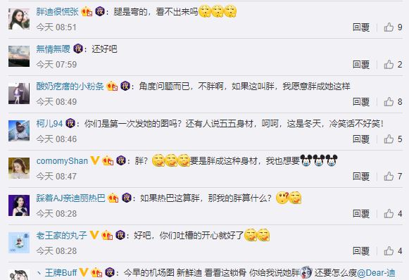 照片一流出,部分網友懷疑迪麗熱巴是否胖了不少,也有網以玩笑表示「很大會生啊」,但有更多粉絲護航,認為是拍照角度問題讓迪麗熱巴高挑身材成了「五五身」,就有網友指出照片中的人物明顯變形,應該角度壞了迪麗熱巴的好身材,並紛紛說到「很明顯那張圖是抓拍角度問題,旁邊的路人下半身也變形了呢 」「你們是第一次發她的圖嗎?還有人說五五身材,呵呵,這是冬天,冷笑話不好笑!」「假的,一個曲膝的動作導致視覺問題」。