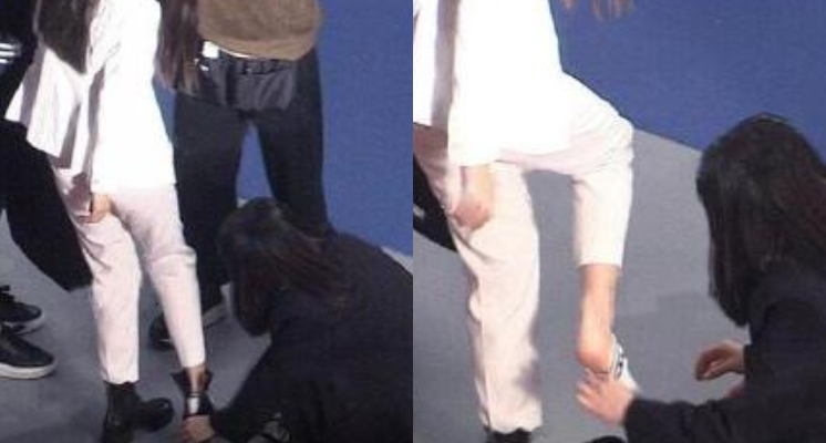 畫面中可見助理換鞋的手法相當熟練,Angelababy站得穩如泰山,助理先是幫他脫下腳上的低筒靴,接下來脫掉白色襪子,緊接著換上另一雙細跟高跟鞋,而另一隻腳也以一樣的方式,迅速且熟練地完成換穿動作。