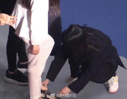 近日,有攝影師拍到Angelababy前往上海拍廣告的照片,照片中的Angelababu身穿幹練的西服套裝,展現職場女強人的風貌,不過在一旁休息時,卻驚見被眾多工作人員圍繞得Angelababy站得直挺挺的,而助理則低頭蹲地替他脫襪換鞋的畫面。