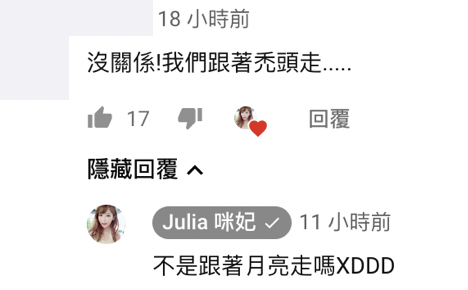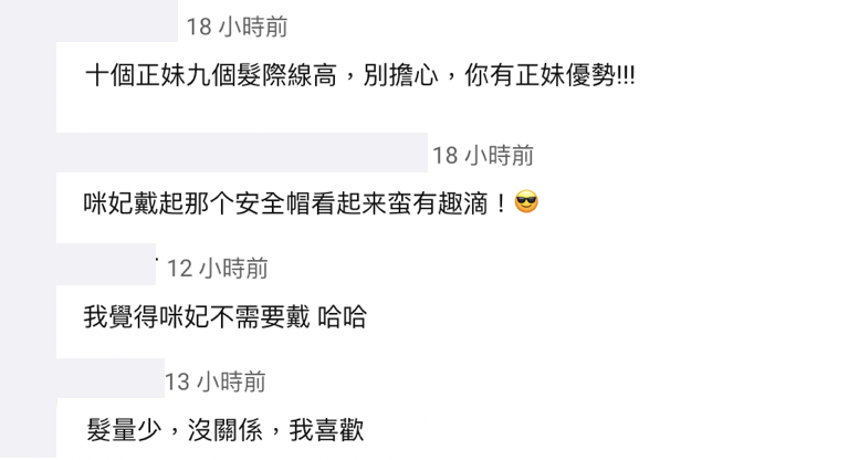 近期禿頭也掀起一股熱潮,高雄市長「韓國瑜」因禿頭的造型成為招牌特色,更出了一本書為《跟著月亮走》,代表著跟著這位禿子市長走,繼續發光。就有網友在影片下方搞笑留言:「沒關係!我們跟著禿頭走....」,咪妃也親自回覆:「不是跟著月亮走嗎XDDD」,其他網友也紛紛留言:「十個正妹九個髮際線高,別擔心,你有正妹優勢!!!」、「咪妃戴起那个安全帽看起來蠻有趣滴!」、「我覺得咪妃不需要戴 哈哈」、「髮量少,沒關係,我喜歡」