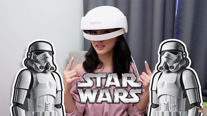 過去在Joeman的開箱影片中,有一次邀請到咪妃試用植髮神器,因咪妃的髮際線比較高,也被他調侃為「禿頭界的正妹」,咪妃也透露自己常被身邊的人說是禿頭、地中海、河豚、髮量少,這次她要開箱一頂神奇的安全帽,這是一頂生髮帽,利用雷射的方式刺激頭皮血液循環,能夠減少掉髮並生長出健康的毛髮,戴上去之後咪妃也笑稱:「有沒有覺得很像在演星際大戰嗎」,開始使用後,咪妃也說道:「最近腦袋不是很靈光,趕快多刺激一點」