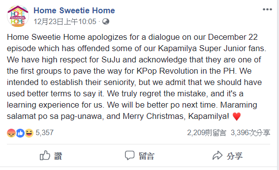 拿兩組團體來比較的是菲律賓的喜劇節目「Home Sweetie Home」,該節目從2014年開播每周六在ABS-CBN電視台上放送,日前節目有其中一集來到韓國首爾拍攝,來賓在節目裡討論現在的流行趨勢,但是當來賓被問到想不想遇到Super Junior時,結果有人立刻回答「他們過氣了,BTS才是現在的大勢」,此話一出立刻在網路上發酵,也受到Super Junior粉絲強烈批評,節目為了止血也趕緊發出正式官方道歉,為無意義的比較致上歉意。