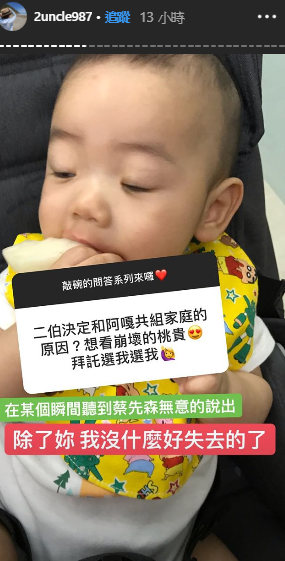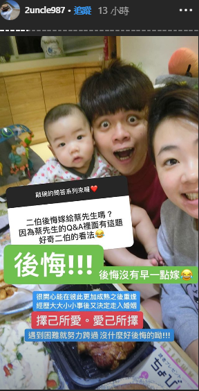 除此之外,也有粉絲問到:「二伯決定和阿嘎共組家庭的原因?」,對此二伯則打上:「在某個瞬間聽到蔡先森無意的說出『除了妳,我沒什麼好失去的了』」,超甜蜜的話瞬間擄獲二伯的心,讓她決定嫁給阿嘎!