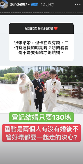 因為有粉絲提到想結婚可是沒有錢,二伯也呼籲粉絲:「登記結婚只要130塊,重點是兩個人有沒有婚後不管好壞都要一起走的決心」,她也放上自己跟阿嘎穿著婚服的照片,恩愛的模樣令人稱羨。而除了愛情問題之外,二伯也回答了許多粉絲想知道的小秘密,喜歡她的粉絲可以趕快追蹤二伯IG!